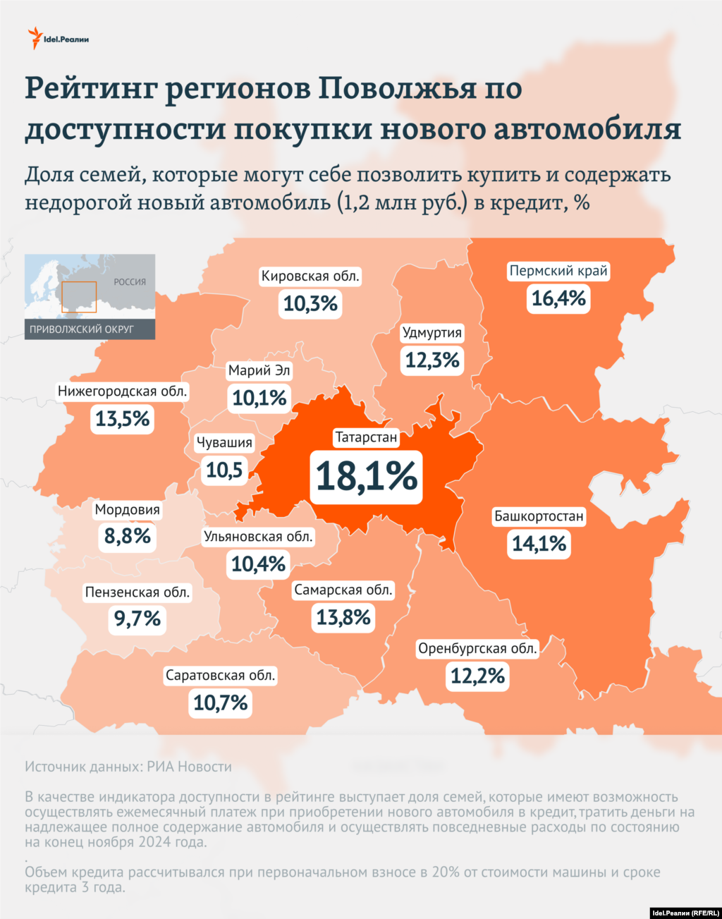 Проще всего купить машину оказалось жителям Татарстана: 18,1% семей смогут взять в кредит автомобиль за 1,2 млн рублей. На втором месте по этому показателю — Пермский край (16,4% семей), следом идут Башкортостан (14,1%), Самарская (13,8%) и Нижегородская области (13,5%).